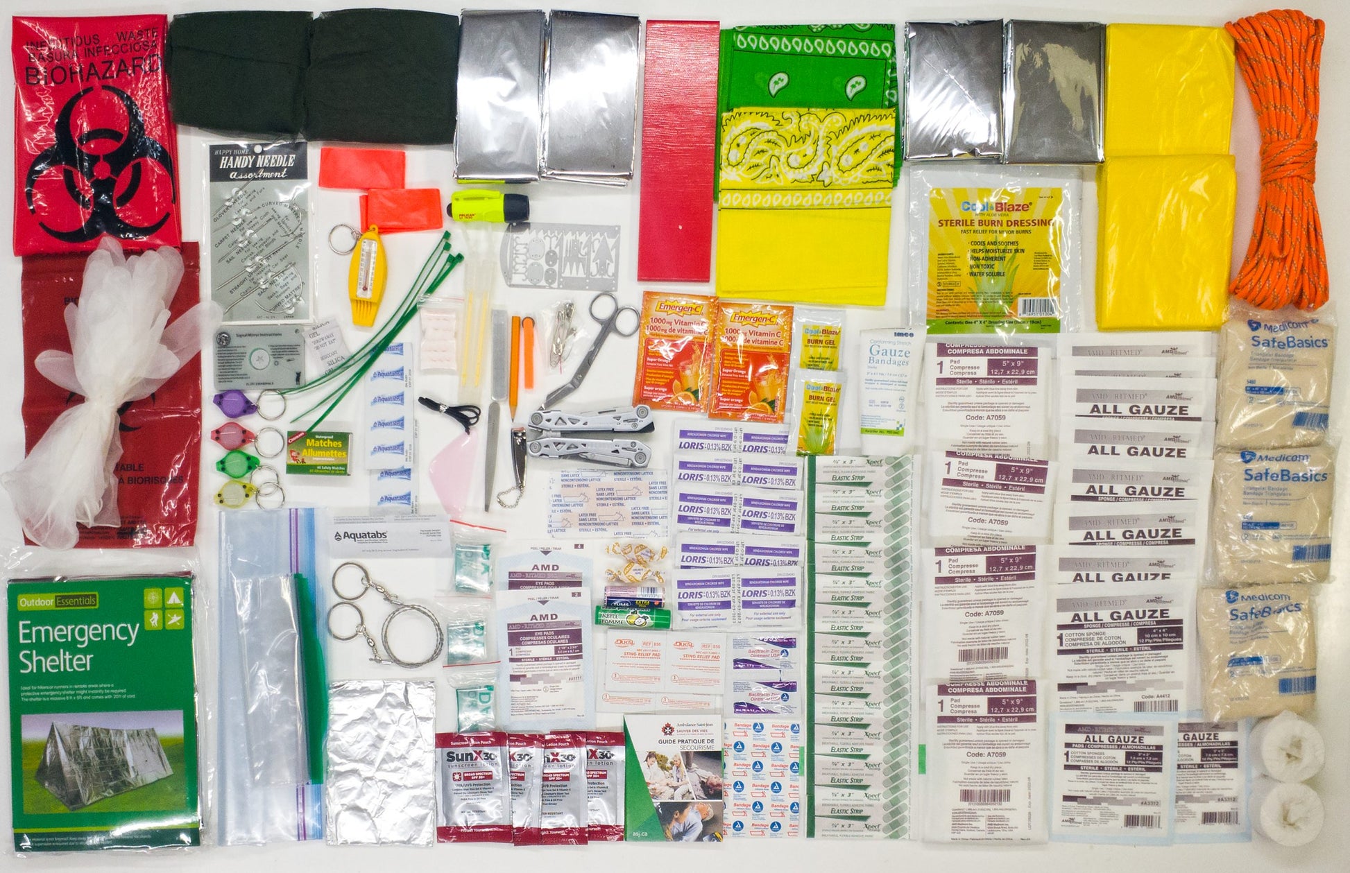 - Ce kit NE FAIT PAS contenir des articles de « luxe » supplémentaires tels que des rations de survie, de l'eau préemballée, des chauffe-mains/pieds, etc.