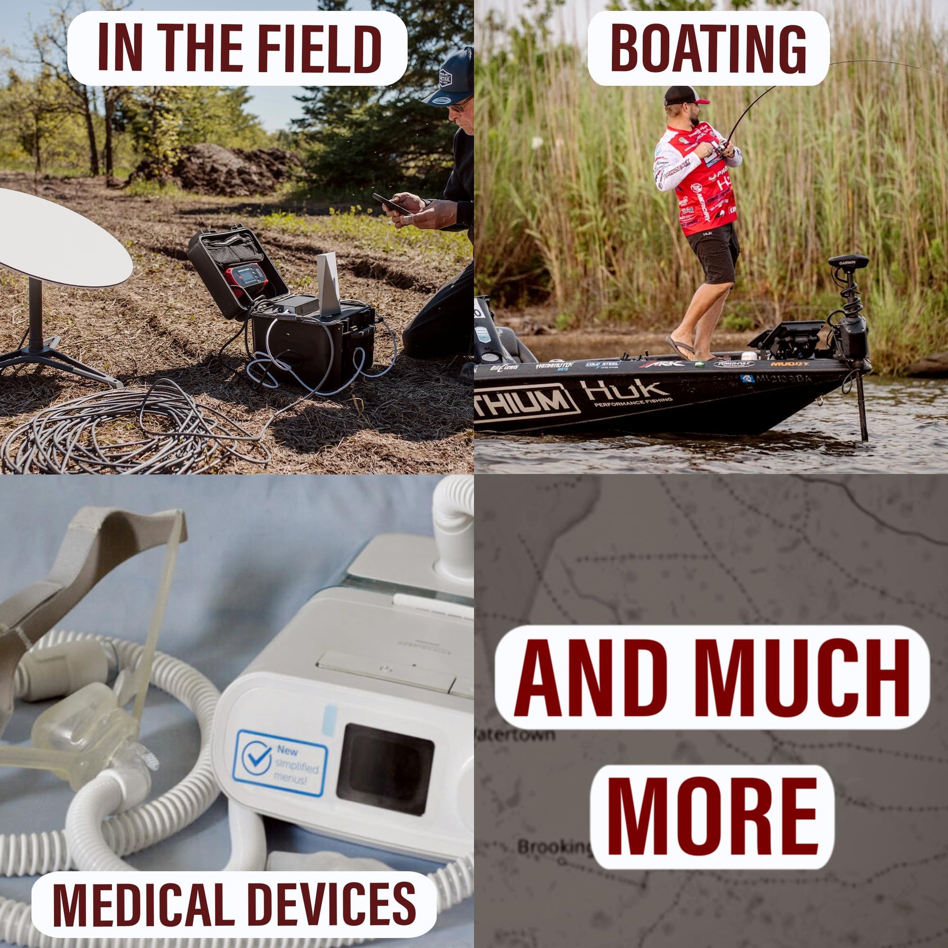 - SO MANY USES: The PowerBox 60 is a mobile charging station for your phone, camera, or personal electronics while playing or working remotely, such as Camping, Construction sites and Emergency use. It’s also a versatile way to power your passions, such as fish finders, ice fishing, small trolling motors, action cameras, jumpstarting, and much, much more. Efficiently charge phones, laptops, camera equipment, TVs, monitors, portable fridges, medical devices, power tools, and more