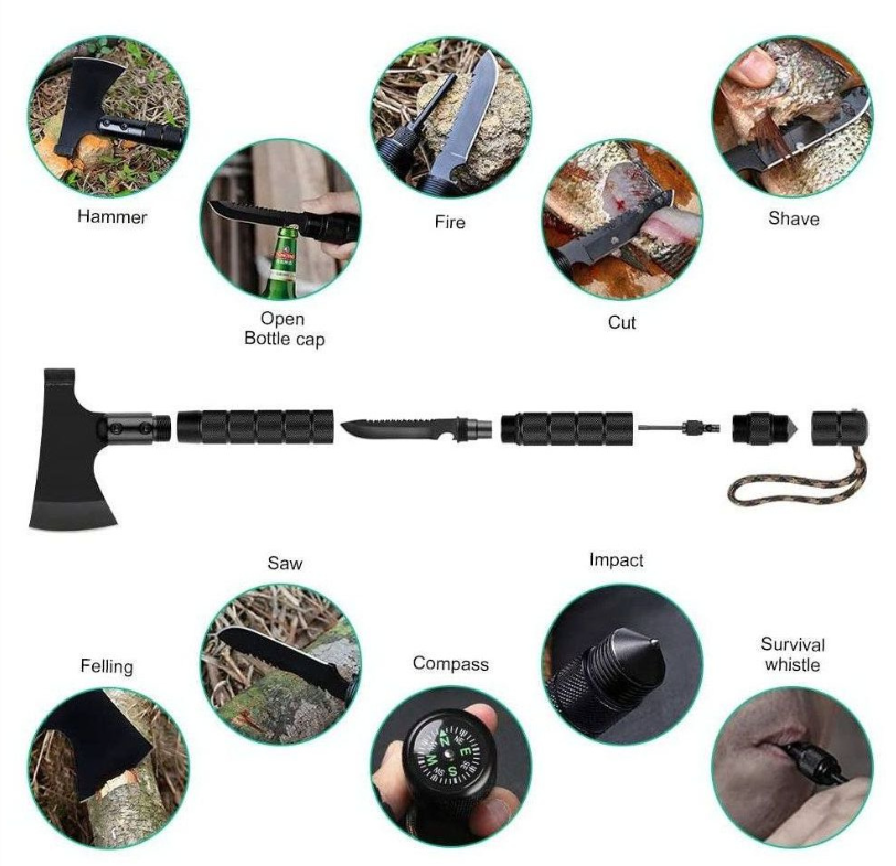 - Hache de survie multi-outils : cette hache de camping avec fourreau n'est pas seulement une hache, mais un marteau. Il se compose d'un couteau à dents de scie, d'un silex en magnésium, d'un sifflet d'urgence, d'un brise-verre, d'une boussole et d'une lampe de poche.