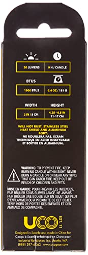 Détails : Il s'agit de la lanterne à bougie pliable classique à longue durée de vie qui fournit une lumière naturelle chaude à des milliers d'amateurs de plein air depuis des décennies. Il est parfaitement adapté à la randonnée, à l'alpinisme, au camping sur neige et à d'autres activités de plein air similaires, tout en fournissant un éclairage de secours pratique. La lanterne à bougie originale utilise une bougie UCO de 9 heures, l'entourant dans le boîtier de lanterne le plus sûr et le plus efficace disponible partout. Le tube de bougie alimenté par ressort pousse la bougie vers le haut pendant qu'elle brûle, gardant la flamme à une hauteur constante. Une fente de visualisation permet à l'utilisateur de surveiller la durée de combustion restante de la bougie à combustion lente. Du fabricant Il s'agit de la lanterne à bougie pliable classique à longue durée de vie qui fournit une lumière naturelle chaude à des milliers d'amateurs de plein air depuis des décennies. Il est parfaitement adapté à la randonnée, à l'alpinisme, au camping sur neige et à d'autres activités de plein air similaires, tout en fournissant un éclairage de secours pratique. La lanterne à bougie originale utilise une bougie UCO de 9 heures, l'entourant dans le boîtier de lanterne le plus sûr et le plus efficace disponible partout. Le tube de bougie alimenté par ressort pousse la bougie vers le haut pendant qu'elle brûle, gardant la flamme à une hauteur constante. Une fente de visualisation permet à l'utilisateur de surveiller la durée de combustion restante de la bougie à combustion lente.