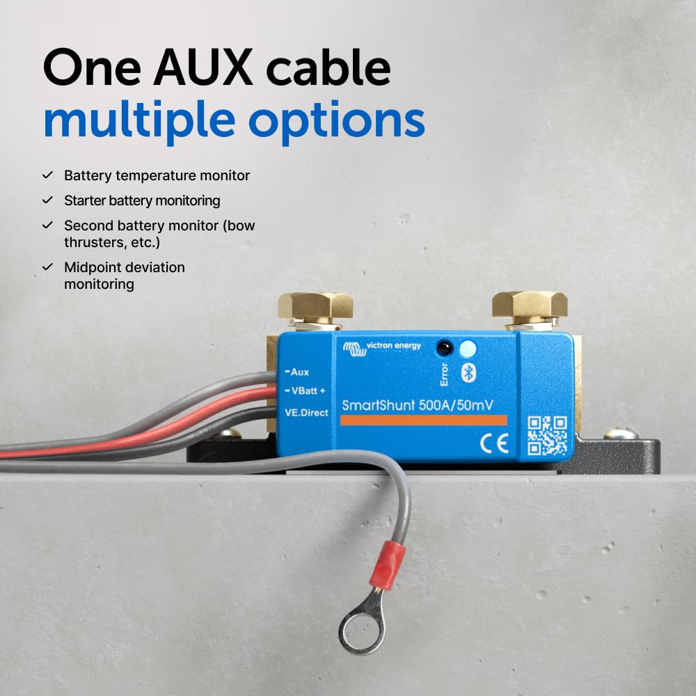 - Victron Energy SmartShunt IP65 is equipped with Bluetooth, has a VE.Direct port and an auxiliary connection that can be used to monitor a second battery, for midpoint monitoring, or to connect a temperature sensor